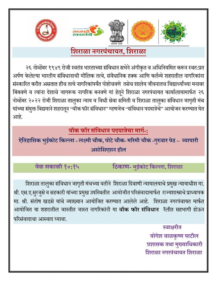 २६ नोव्हेंबर १९४९ रोजी स्वतंत्र भारताच्या संविधान सभेने अंगीकृत व अधिनियमित करून स्वत:प्रत अर्पण केलेल्या भारतीय संविधानाची मौलिक तत्वे, संवैधानिक हक्क आणि कर्तव्ये शहरातील नागरिकांना संस्कारित करीत असतात हीच तत्वे नागरिकांपर्यंत पोहोचवणे तसेच शालेय जीवनातच विद्यार्थ्यांच्या मनावर बिंबवणे व त्यांना देशाचे जागरूक नागरिक बनवणे यां हेतूने शिराळा नगरपंचायत कार्यालायामार्फत २६ नोव्हेंबर २०२२ रोजी शिराळा तालुका न्याय व विधी सेवा समिती व शिराळा तालुका संविधान जागृती मंच यांच्या संयुक्त विद्यमाने शहरातून वॉक फॉर संविधान म्हणजेच संविधान पदयात्रेचे आयोजन करण्यात येत आहे. या पदयात्रेची सुरुवात उद्या दिनांक २६/११/२०२२ रोजी सकाळी १०:१५ वाजता जागतिक वारसा साप्ताह समाप्तीच्या पार्श्वभूमीवर शहरातील ऐतिहासिक भुईकोट किल्ल्यावरून होईल, तद्नंतर हि पदयात्रा शहरातील लक्ष्मी चौक, पोटे चौक, मरिमी चौक, गुरुवार पेठ मार्गे व्यापारी असोसिएशन हॉल पर्यंत असेल. व्यापारी असोसिएशन सभागृहात २६/११/२००८ रोजीच्या मुंबई दहशतवादी हल्ल्यातील शहीद जवानांना श्रद्धांजली वाहण्यात येईल. व शिराळा तालुका संविधान जागृती मंचच्या वतीने शिराळा दिवाणी न्यायालयाचे प्रमुख न्यायाधीश मा. श्री. एस. ए.सुरजुसे व सहकारी यांच्या प्रमुख उपस्थितीत आयोजीत परिसंवादामार्फत राज्यशास्त्राचे प्राध्यापक मा. श्री. संतोष खडसे यांचे व्याख्यान आयोजित करण्यात आलेले आहे. शिराळा नगरपंचायत मार्फत आयोजित या शहरातील जास्तीत जास्त नागरिकांनी या वॉक फॉर संविधान रॅलीत सहभागी होऊन परिसंवादाचा आस्वाद घ्यावा, असे आवाहन शिराळा नगरपंचायत चे प्रशासक तथा मुख्याधिकारी श्री. योगेश बाळकृष्ण पाटील व शिराळा तालुका न्याय व विधी सेवा समिती यांनी शहरातील नागरिकांना केले आहे.