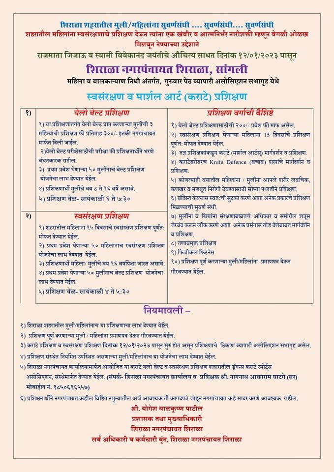 शहरातील महिलांना स्वसंरक्षणाचे प्रशिक्षण देऊन, त्यांना एक खंबीर व आत्मनिर्भर नारीशक्ती म्हणून वेगळी ओळख मिळवून देण्याच्या उद्देशाने , राजमाता जिजाऊ व स्वामी विवेकानंद जयंतीचे औचित्य साधत, शिराळा नगरपंचायत मार्फत महिला व बालकल्याण निधी अंतर्गत, गुरुवार पेठ व्यापारी असोसिएशन सभागृह येथे दिनांक १२/०१/२०२३ पासून १६ वर्षांवरील मुली व महिलांसाठी सायंकाळी ४ ते ५:३० या वेळेत स्वसंरक्षण प्रशिक्षण व वय वर्षे ८ ते १६ या गटातील मुलींसाठी सायंकाळी ६ ते ७:३० या वेळेत येलो बेल्ट मार्शल आर्ट (कराटे) प्रशिक्षण आयोजीत करण्यात येत आहे.