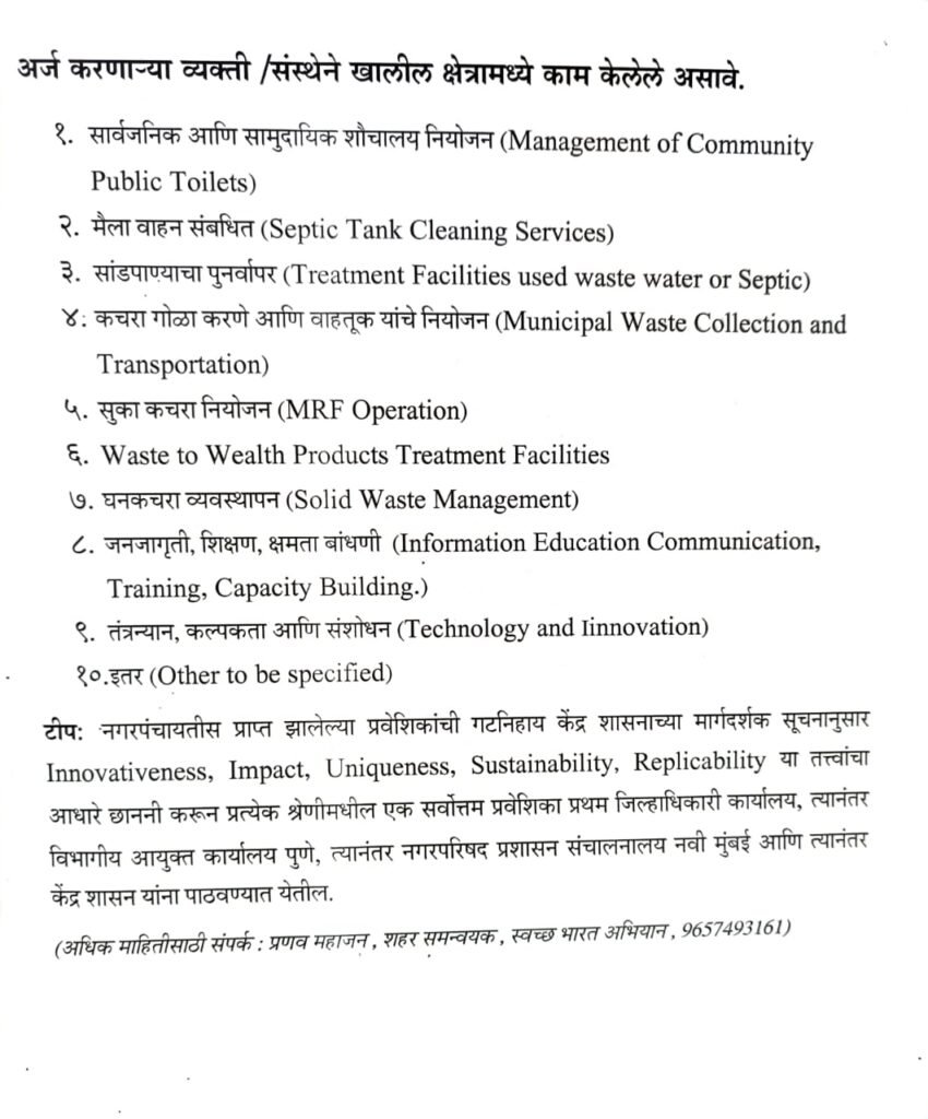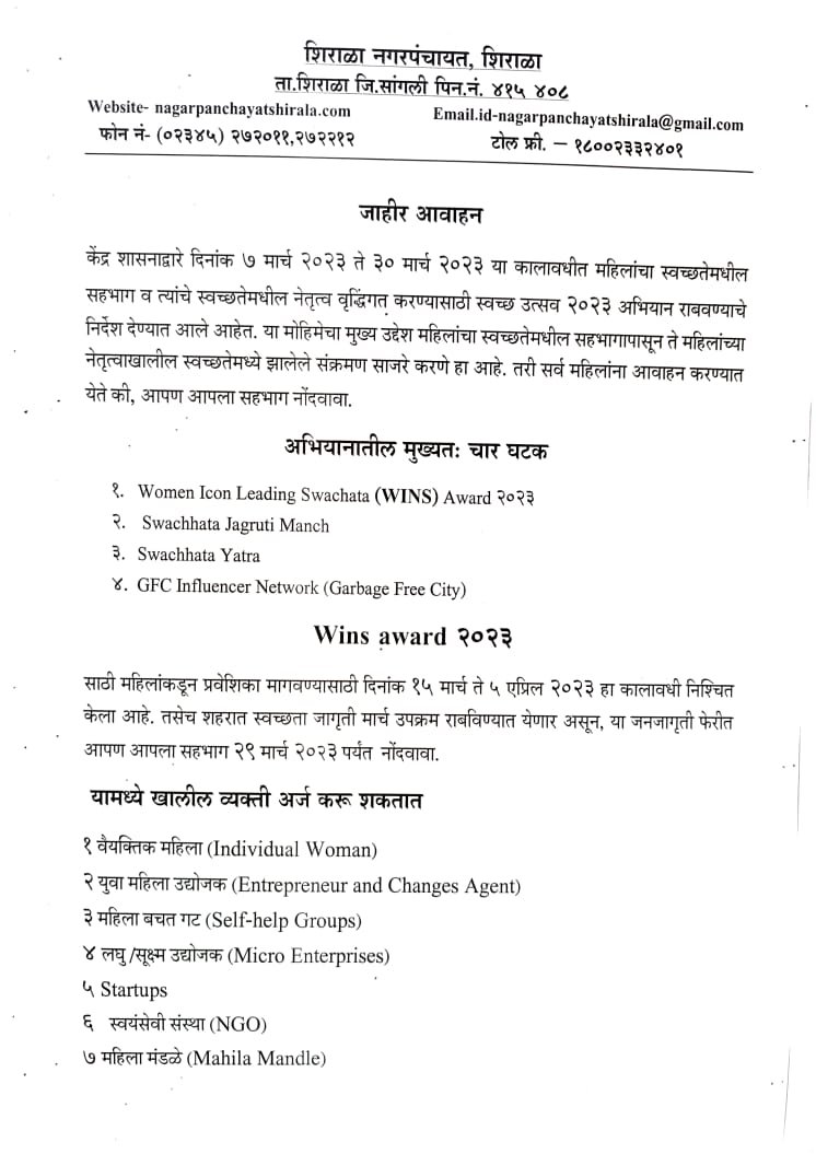 जाहीर आवाहन केंद्र शासनाद्वारे दिनांक 7 मार्च 2023 ते 30 मार्च 2023 या कालावधीत महिलांचा स्वच्छतेमधील सहभाग व त्यांचे स्वच्छतेमधील नेतृत्व वृद्धिंगत करण्यासाठी स्वच्छ उत्सव 2023 अभियान राबवण्यात येत आहे. या मोहिमेचा मुख्य उद्देश महिलांचा स्वच्छतेमधील सहभागापासून ते महिलांच्या नेतृत्वाखालील स्वच्छतेमध्ये झालेले संक्रमण साजरे करणे हा आहे. तरी सर्व महिलांना आवाहन करण्यात येते की, आपण आपला सहभाग नोंदवावा.