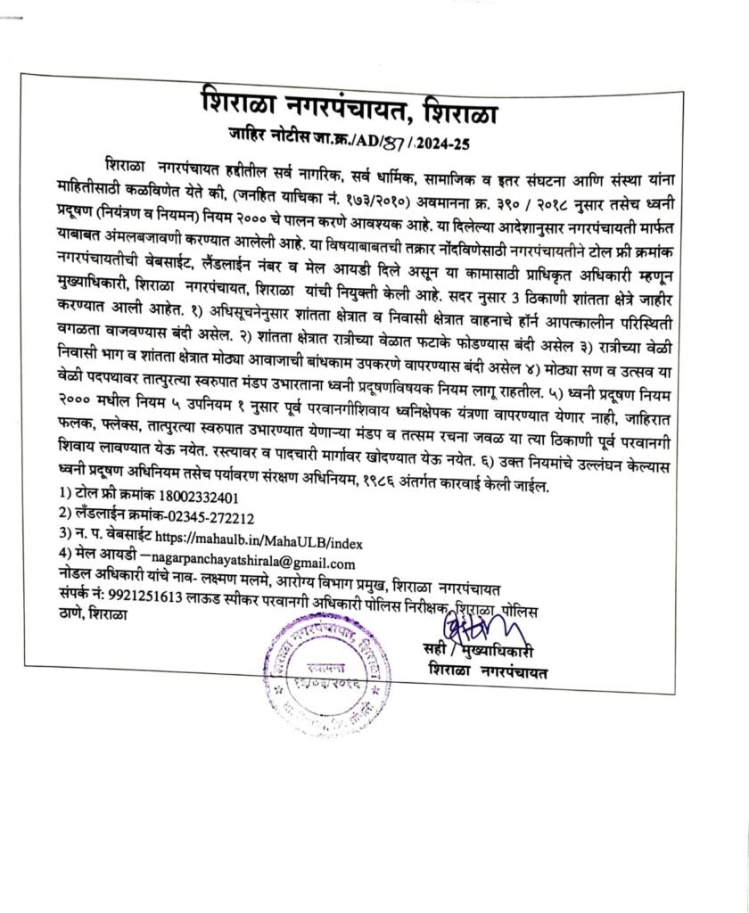 जनहित याचिका 173/2010 अवमानना क्र. ३९० / २०१८ नुसार तसेच ध्वनी प्रदूषण (नियंत्रण व नियमन) नियम २००० चे पालन करणे आवश्यक आहे